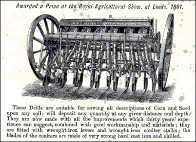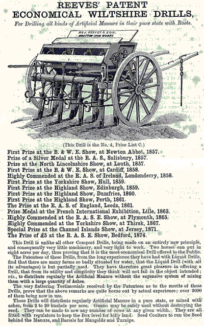 The firm of R & J Reeves & Son Ltd was established in 1808 and can be traced back to Thomas Peplar Reeves (c.1777-1849), a blacksmith. The firm was located in Bratton, 4 miles east of Westbury, Wiltshire. By 1847 there was a smithy department, woodworking section and a machinery shop, it was estimated that the firm employed 6 people. Thomas’s sons Robert and John joined him and by 1853 the firm had become known as R & J Reeves. The firm were exhibiting implements and winning medals. They catered for the farmers of South Wiltshire initially manufacturing simple implements, undertaking horse shoeing work and maintenance. The business grew from 1852 to the 1800’s. Two of Robert’s sons, Thomas and Henry became partners in the business. The firm became R & J Reeves & Son by 1882. They did agency work for other manufacturers for example selling churns for Hathaway of Chippenham and steam engines for Brown and May of Devizes. They also had agents selling Reeves products. Robert died in 1896 and John in 1892. By the end of the nineteenth century the elevator business had become their most important activity. Oswald and Nelson, sons of Thomas, and Robert son of Henry bought the firm in 1902. In the 1950’s the company employed 40 people, and undertook agency work, repair and maintenance and manufactured drills, rakes, lamb creeps, troughs, racks, shepherd’s huts and equipment for dairies and horticulture. The firm went into receivership in 1970 and was sold. The sale included agricultural machinery, plant, blacksmiths tools and equipment, woodworking machinery and tools, agricultural spares, a lorry, scrap cast and 60 tons of scrap iron.