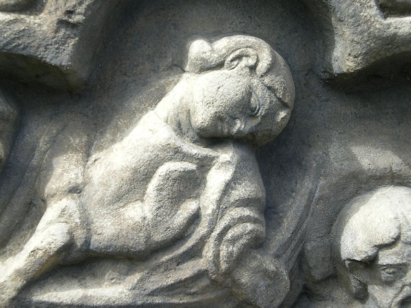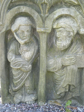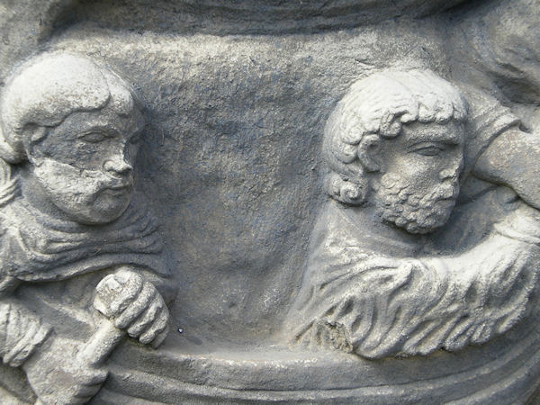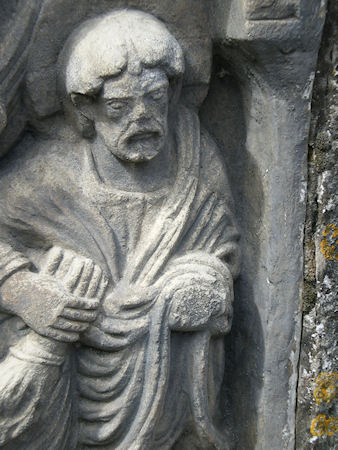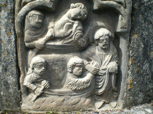 The following pictures are of two relief panels at the base of the remains of an octagonal washouse (lavatorium) in the cloister of the Cluniac priory of Wenlock in Shropshire. They deal with the theme of 'Christ Calling the Apostles'. These Romanesque sculptures date from 1079 and 1082, when the abbey was rebuilt on the site of an earlier 7th century foundation, by Roger de Montgomery. One panel shows two apostles standing beneath arches, the other has been interpreted as Christ sleeping in a boat on a lake (top) and Christ calling saints Andrew and Peter. Both panels are full of strength and character. They are carved out of local 'Wenlock marble'. The major share of architectural activity in the second part of the 11th century was sponsored by the great monastic communities. The Cluniac order, at the peak of its power, played a primary role in the patronage of construction. Thus a number of significant Cluniac churches connected with great 12th-century pilgrimages—St. Martin in Tours, St. Sernin in Toulouse, and Santiago de Compostela in Spain—show great similarity in plan and overall design. The Cuniac Order owed its allegience directly to the Abbey of Cluny in France. It is therefore likely that it was French masons who carried out the carvings.
